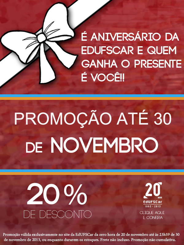 Em comemoração aos 20 anos de seu funcionamento, a Editora da Universidade Federal de São Carlos coloca todo o seu catálogo em promoção, incluindo os lançamentos. Todos os títulos estão com desconto de 20% até o dia 30 de novembro, para compras exclusivas via o site www.editora.ufscar.br, com opções de frete via SEDEX, PAC e e-SEDEX.