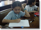 Érica Oliveira da Silva, de 8 anos, escreveu o conto “As fadas do campo” enquanto sua amiga Sheila Helena Ribeiro Santos, 9, ilustrou a história com a casa mágica das fadas e um arco-íris. “Fadas” também foi o tema de Daniela Alves da Silva (foto), 8, em “As fadas e a fada bruxa”, ilustrada por Jeniffer Santana dos Santos, 8.