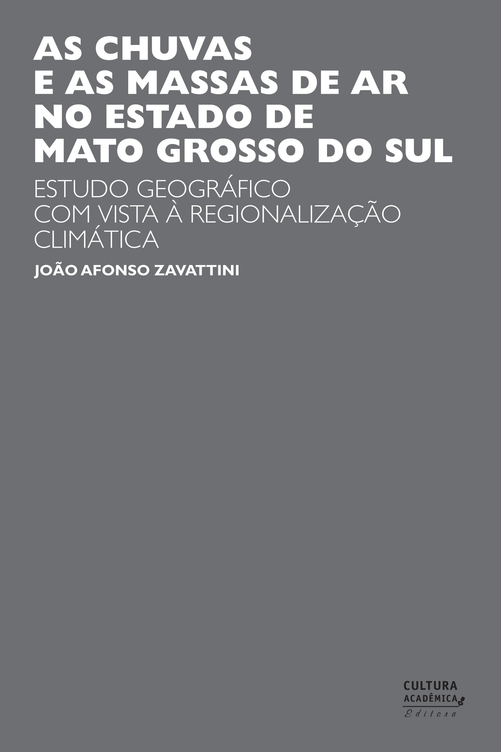 O Estado do Mato Grosso do Sul está situado na confluência dos principais sistemas atmosféricos da América do Sul, possuindo mais de um tipo de regime pluviométrico, sendo que em algumas áreas encontram-se regimes do tipo “Brasil Central” e em outras o regime “Brasil Meridional”. Sendo assim, As chuvas e as massas de ar no estado de Mato Grosso do Sul, lançamento do selo Cultura Acadêmica, fornece um tratamento dinâmico às questões climáticas do Mato Grosso, explorando a circulação atmosférica regional e as implicações pluviais sofridas na área.