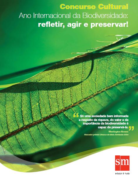 Campanha da Biodiversidade - O Concurso Cultural Ano Internacional da Biodiversidade: refletir, agir e preservar! é mais uma das iniciativas de Edições SM em prol da biodiversidade. O tema vem ao encontro do projeto cultural e educativo de Edições SM, que inclui a publicação de materiais didáticos e paradidáticos voltados para uma educação integral, pautada em valores e focada na formação de cidadãos participativos e críticos para a construção de uma sociedade mais justa e harmoniosa, com respeito às diferenças e ao meio ambiente.