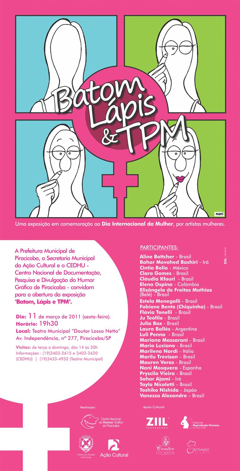 A exposição Batom, Lápis e TPM, em comemoração ao Dia Internacional da Mulher, reúne 58 obras de 25 artistas do humor gráfico para homenagear, criticar, refletir e tentar compreender a mulher contemporânea. Além das brasileiras, há representantes da Argentina, Colômbia, Espanha, Irã, Itália, Japão e México.